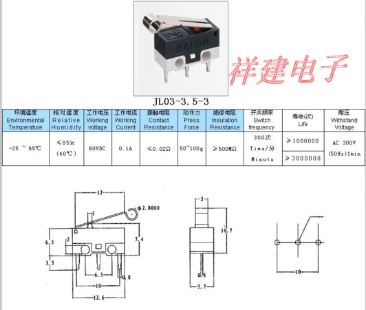 祥建电子科技有限公司是一家开发、设计、生产销售及各种开关.插座:振动开关,弹簧开关,拨动开关,叶片开关,轻触开关,按键开关,耳机插座,DC插座。