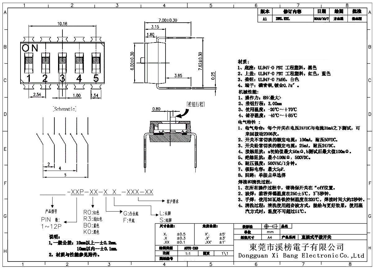 3. 绝缘阻抗: AC 500V 1Minute 4. 耐焊温度: 250±5°5s
