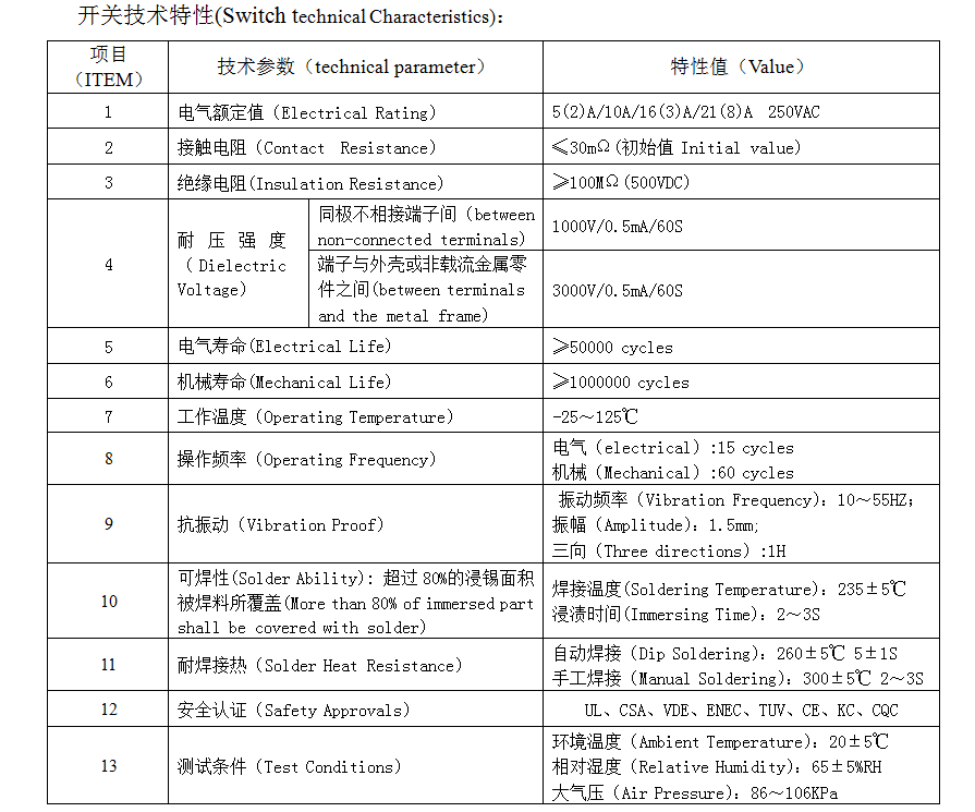 1.额定负荷: DC 30V 125V 250V 1A 5A 10A 16A 20A